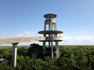 トラム(屋根つき、窓なしのオープンバス)で約2時間かけて園内を1周する。折り返し地点ではトラムから降りてエバーグレーズのシンボルでもある真っ白のタワー(展望台)に登る。このタワーは螺旋状のスロープで、頂上から見られる360度の視界は、まさにフロリダならではのエバーグレーズ湿地帯の風景と言える。